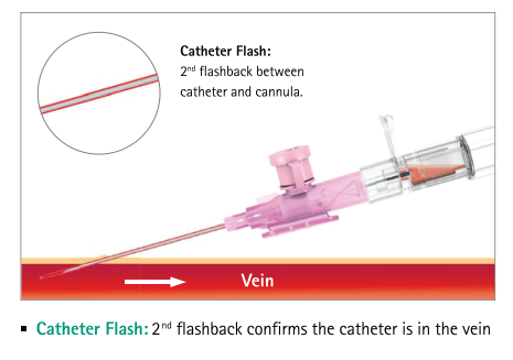 Passive Safety Shield – A passive fully automatic protection helps eliminating needlestick injuries and related infections. It deploys automatically, cannot be bypassed and requires no user activation • Double Flashback Technology – Confirms that both needle and catheter capillary are inside the vessel. First needle flash confirms needle is in vein, second catheter flash confirms catheter is in vein • Universal Back Cut Bevel – Allows for a wide choice of insertion angles and is designed for minimal puncture trauma